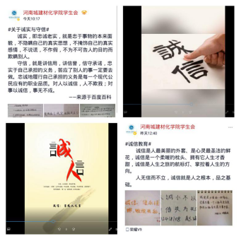 本次“诚信教育月”系列活动号召材化学子自我教育、自我完善,养成诚信待人、诚信立身的良好习惯,加强了学院的诚信建设,同时为打赢疫情防控阻击战凝聚青春力量。