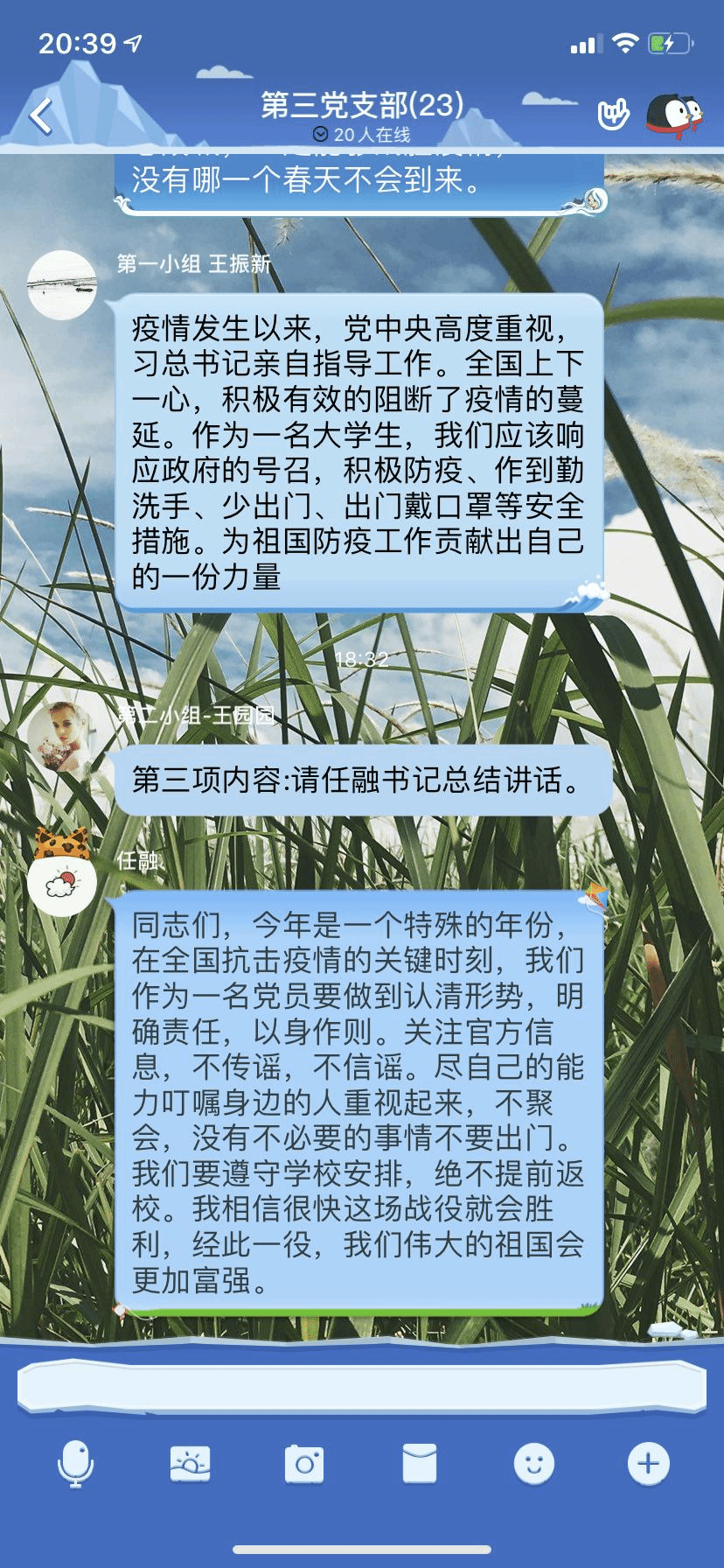 党支部书记任融同志做最后总结,她强调:今年是一个特殊的年份,在全国抗击疫情的关键时刻,我们作为一名党员要做到认清形势,明确责任,以身作则。关注官方信息,不传谣,不信谣。尽自己的能力叮嘱身边的人重视起来,不聚会,没有不必要的事情不要出门。要遵守学校安排,绝不提前返校。相信很快这场战役就会胜利,经此一役,我们伟大的祖国会更加富强。